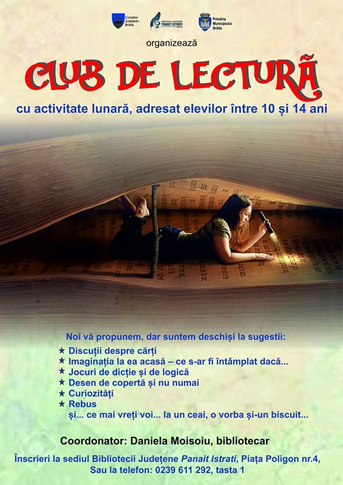 Înscrierile se pot face la sediul Bibliotecii Județene «Panait Istrati», din Piața Poligon nr. 4, sau la telefon 0239 611 292, tasta 1. Coordonator: Daniela Moisoiu, bibliotecar.”, se precizează în anunțul făcut public astăzi.