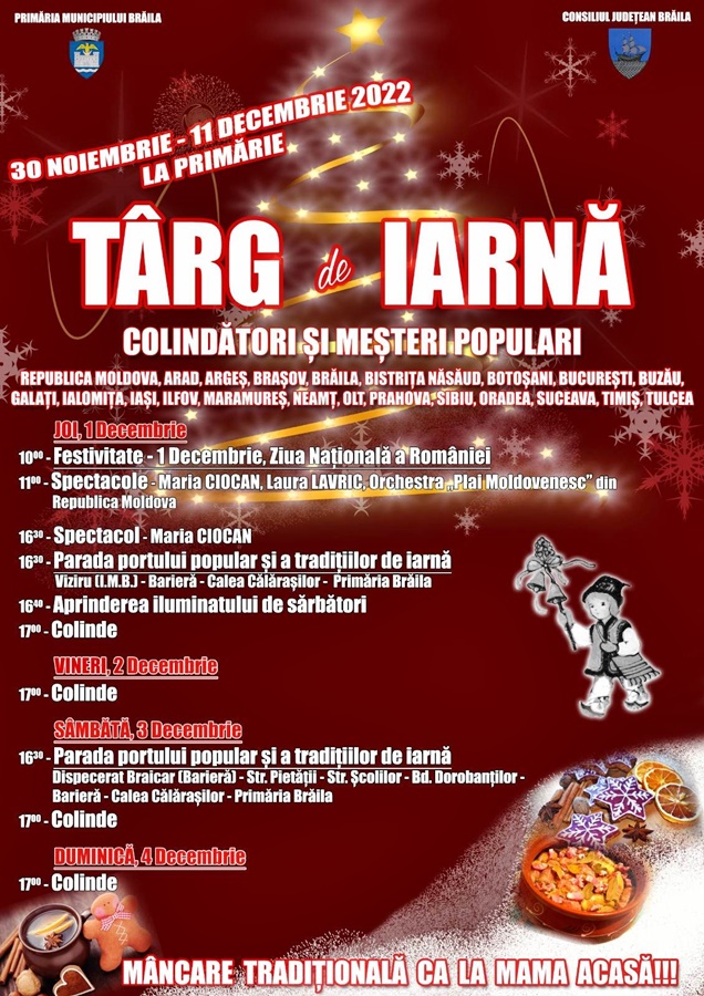 Primăria Municipiului Brăila, în parteneriat cu Instituția Prefectului Județul Brăila și Consiliul Județean Brăila, organizează, în perioada 30 noiembrie – 11 decembrie 2022, unul dintre cele mai mari evenimente anuale, “Târgul de Iarnă”.