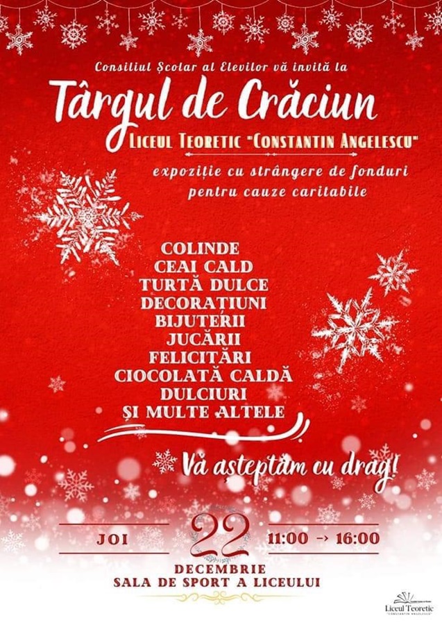 Consiliul Școlar al Elevilor Liceului Teoretic “Constantin Angelescu”, din Ianca, organizează joi, 22 decembrie 2022, între orele 11:00 – 16:00, “Târgul caritabil de Crăciun”.