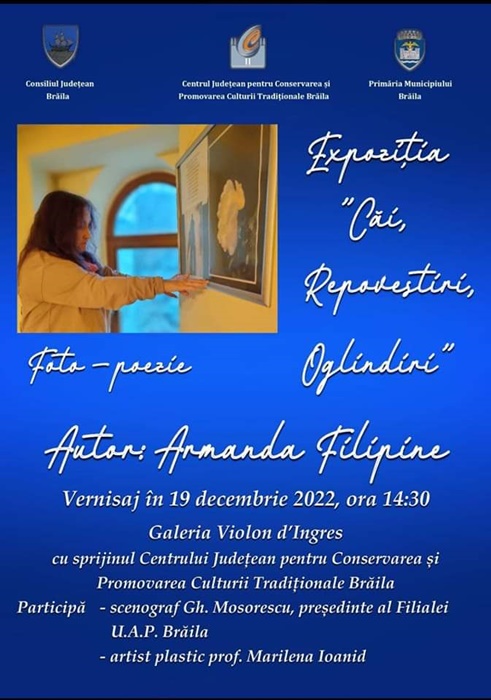 Expoziție inedită la galeria “Violon d’Ingres”, sub semnătura Armandei Filipine. Sub genericul “Căi. Repovestiri. Oglindiri”, Armanda Filipine, scriitor și jurnalist brăilean, a adunat câteva secvențe foto din Brăila, “orașul locuirii noastre de zi și de noapte, locuire mai mult sau puțin fericită în funcție de prea mulți factori ca să facă și ei obiectul expunerii de față”, după cum menționează chiar autoarea expoziției.