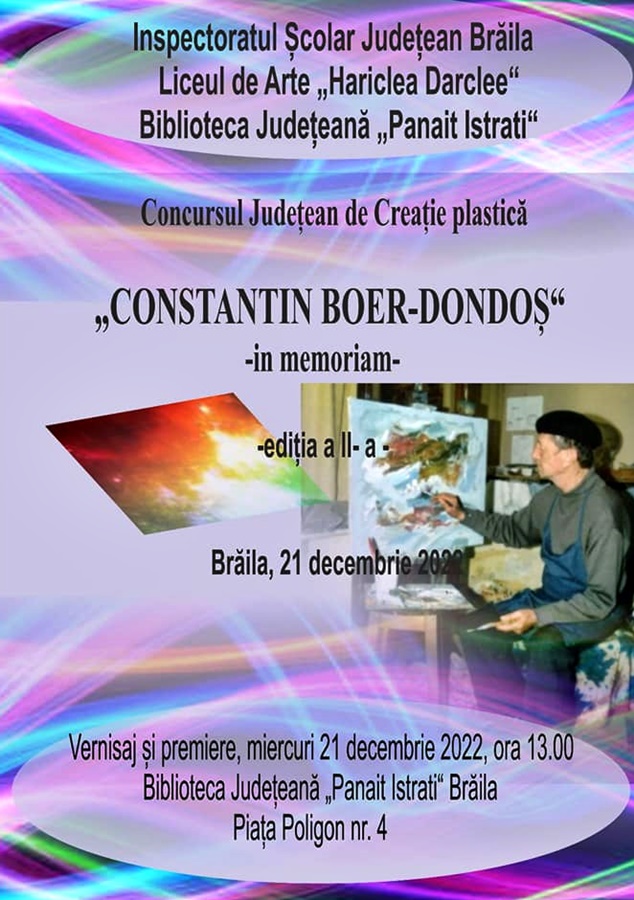 Miercuri, 21 decembrie 2022, începând cu ora 13:00, la Centrul Multicultural “Dunărea”, din cadrul Bibliotecii Județene Brăila, va avea loc premierea câștigătorilor Concursului Județean de creație plastică “Constantin Boer Dondoș” și vernisajul expoziției care conține lucrările realizate de participanții la concurs.