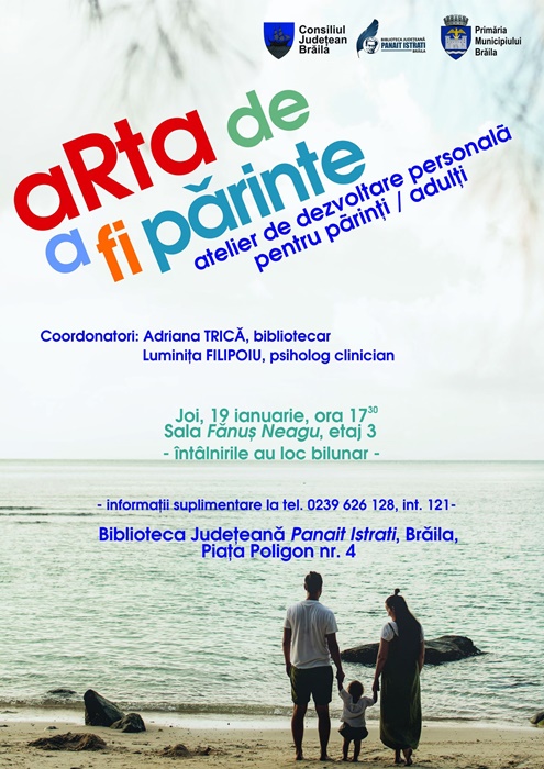 Începând cu 19 ianuarie 2023, la Biblioteca Județeană “Panait Istrati” Brăila se va organiza workshop-ul gratuit “Arta de a fi părinte”, la care sunt invitați toți cei care doresc să afle informații folositoare despre procesul prin care se poate sprijini dezvoltarea fizică, emoțională și intelectuală a copiilor, de la naștere până la maturitate.