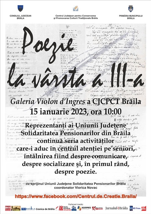 Evenimentul desfășurat sub titlul “Poezie la vârsta a treia”, din data de 15 ianuarie 2023, va fi transmis live, pe pagina de facebook Centrul.de.Creatie.Braila, începând cu ora 10:00.