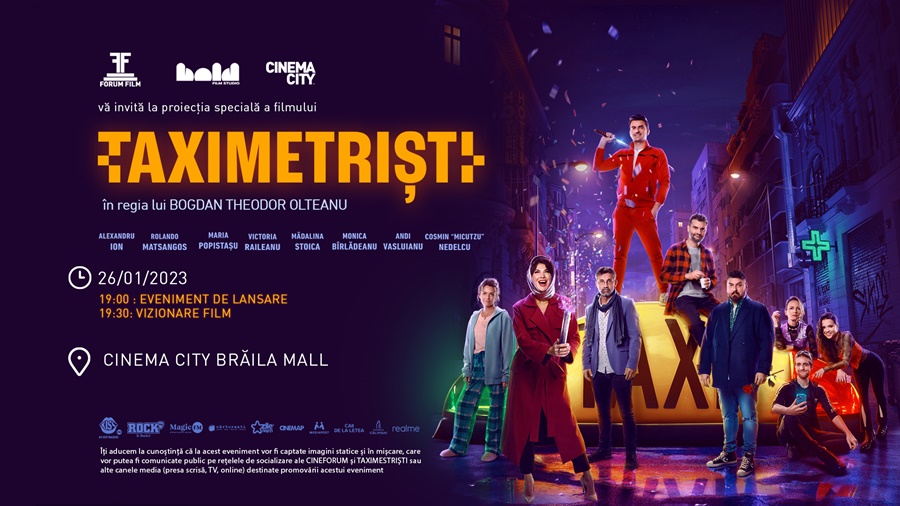 Joi, 26 ianuarie 2023, la Cinema City Brăila Mall, de la ora 19:00, va avea loc proiecția specială, din Brăila, a filmului “Taximetriști”, în regia lui Bogdan Theodor Olteanu (cu Alexandru Ion, Rolando Matsangos, Maria Popistașu, Monica Bîrlădeanu, Andi Vasluianu, Cosmin Nedelcu “Micutzu”, Mădălina Stoica, Ana Maria Guran, Carol Ionescu, Nicoleta Hâncu, Vlad Ionuț Popescu, Alex Mircioi, Florentina Năstase, Adrian Nicolae, Spike).