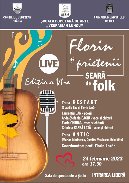 Cu ocazia sărbătoririi Dragobetului, Şcoala Populară de Arte “Vespasian Lungu” Brăila invită iubitorii de muzică folk la cea de-a VI-a ediţie a Serii de folk “Florin şi prietenii”.