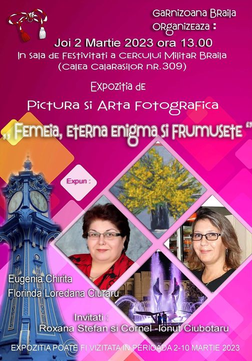 La începutul lunii Martie, o lună dedicată femeilor, Garnizoana Brăila organizează joi, 2.03.2023, începând cu ora 13:00,o expoziție de pictură și artă fotografică, sub titlul “Femeia, eterna enigmă și frumusețe”.
