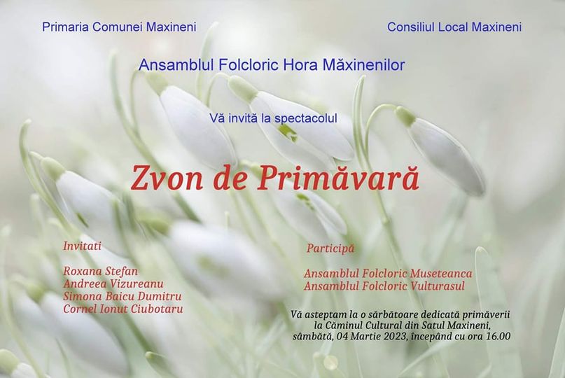 Primăria Comunei Măxineni, Consiliul Local Măxineni și Ansamblul Folcloric “Hora Măxinenilor” vă invită sâmbătă la spectacolul “Zvon de Primăvară”.