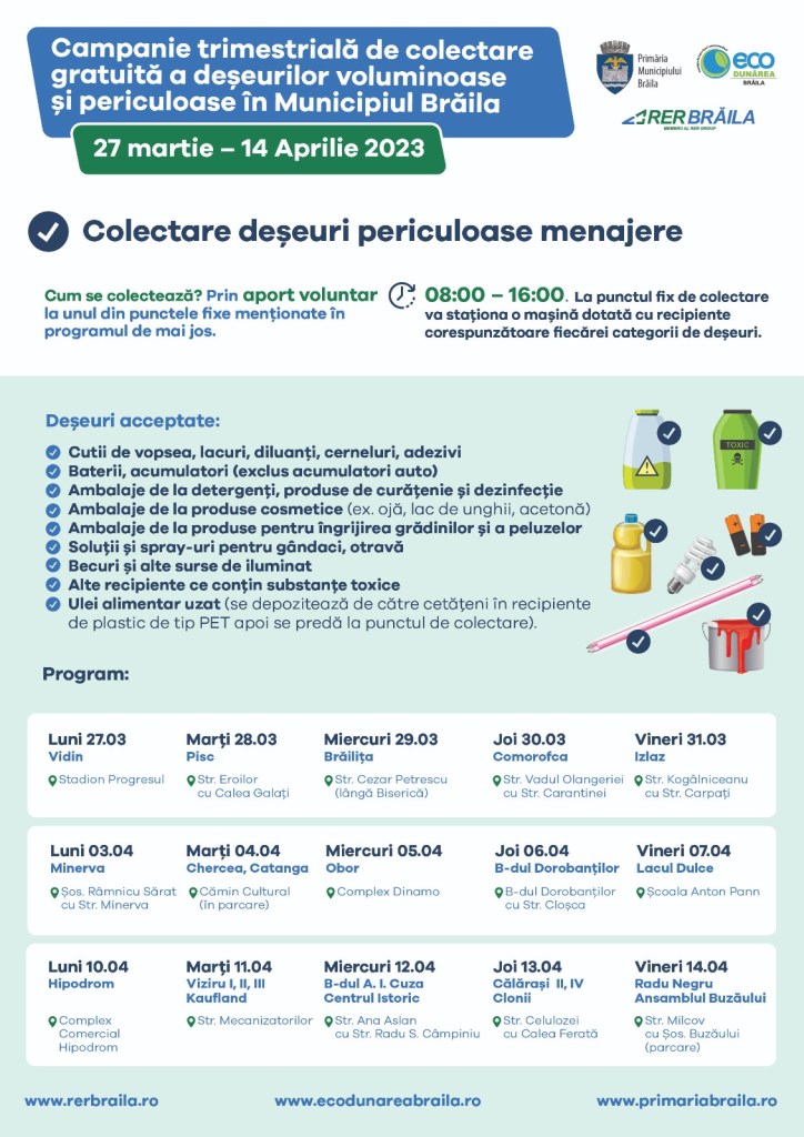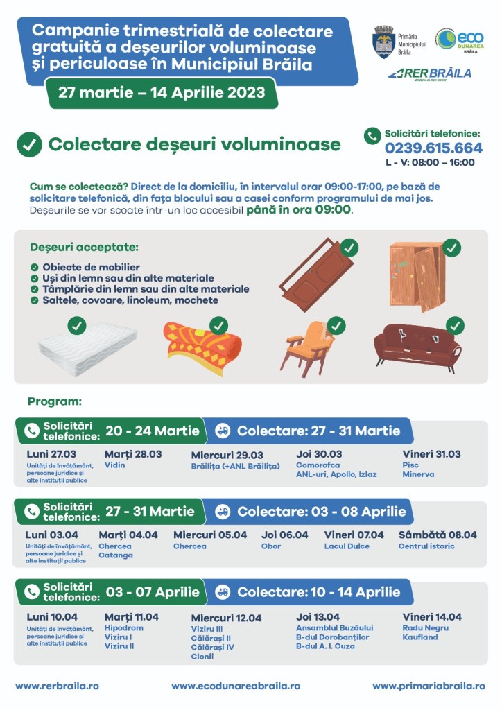 În perioada 27 Martie – 14 Aprilie 2023, se va derula prima campanie trimestrială de colectare GRATUITĂ a deșeurilor voluminoase și a celor periculoase menajere, în tot Municipiul Brăila, organizată de compania de salubritate, RER Brăila, în parteneriat cu Primăria Municipiului Brăila.