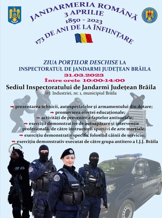 Inspectoratul de Jandarmi Județean Brăila își va deschide porțile vineri, 31 martie, între orele 10:00 și 14:00, cu prilejul sărbătoririi a 173 de ani de la înființarea acestei Arme.