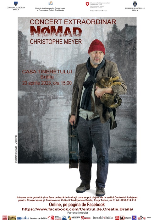 Brăila se pregătește pentru o nouă surpriză! Pentru prima dată în România, în ziua de 23 aprilie 2023, începând cu ora 15:00, Consiliul Județean Brăila și Centrul Județean pentru Conservarea și Promovarea Culturii Tradiționale Brăila, alături de Primăria Municipiului Brăila și Ambasada Elveției în România, invită iubitorii de muzică de calitate, la un eveniment cultural de înaltă ținută artistică, concertul extraordinar “NøMad”. Aceta este susținut de artistul de talie internațională, Christophe Meyer, compozitor și muzician elvețian, parte dintr-un turneu special, un eveniment în care publicului îi este propus un concept inedit de muzică.
