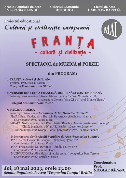 Joi, 18 mai 2023, începând cu ora 13:00, la sediul Şcolii Populare de Arte “Vespasian Lungu”, va avea loc spectacolul de muzică şi poezie “Franţa – cultură şi civilizaţie”.
