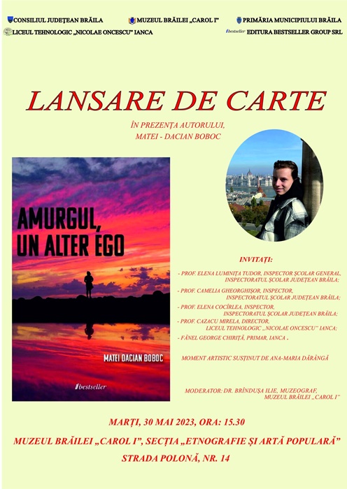Marți, 30 mai 2023, ora 15:30, la Muzeul Brăilei “Carol I” – Secția Etnografie și Artă Populară (strada Polonă, nr. 14), va avea loc lansarea carții “Amurgul, un alter ego”, semnată de Matei-Dacian Boboc, apărută anul acesta la Editura Bestseller din Chișinău.