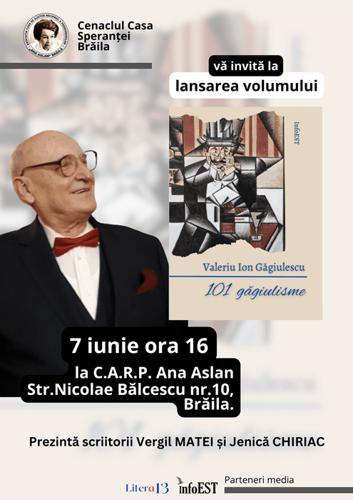 Cenaclul Casa Speranței Brăila invită brăilenii la lansarea volumului intitulat “101 găgiulisme”, semnat de scriitorul Valeriu Ion Găgiulescu,.
