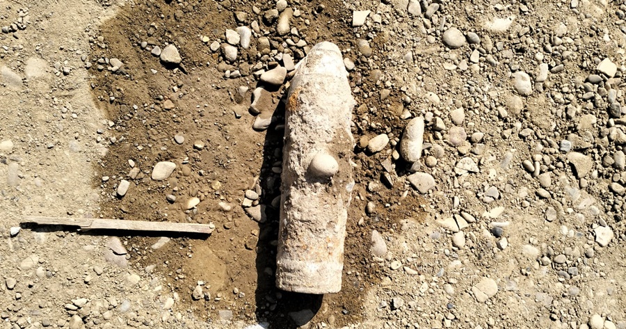 “Pe timpul descărcării materialului folosit la terasamentul drumului, a fost descoperit un proiectil exploziv calibrul 76 mm, în stare avansată de oxidare.
