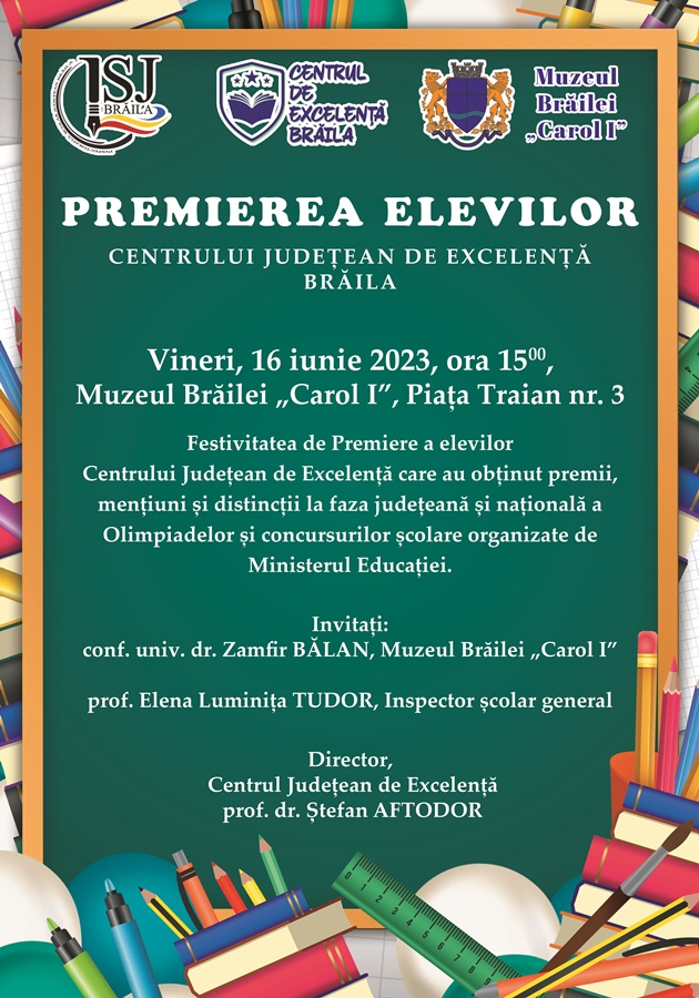 Vineri, 16 iunie 2023, ora 15:00, la sediul Muzeului Brăilei “Carol I” (Piața Traian, nr. 3) se va desfășura festivitatera de premiere a elevilor Centrului Județean de Excelență Brăila.