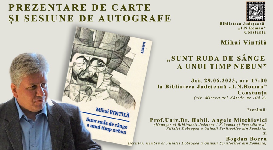 Biblioteca Județeană “I.N.Roman” Constanța, cu sediul în strada Mircea cel Bătrân nr. 104A, invită pe cei care iubesc poezia, la lansarea volumului de versuri “Sunt ruda de sânge a unui timp nebun” al poetului brăilean Mihai Vintilă. Evenimentul va avea loc în cadrul bibiotecii constânțene joi, 29.06.2023, începând cu ora 17:00.Licențiat în Drept și economie, Mihai Vintilă este autorul a șapte volume de versuri și redactor șef al revistei Litera 13. De-a lungul timpului, a fost inclus în mai multe dicționare și antologii, iar activitatea lui scriitoricească a fost răsplătită cu diverse premii, printre care menționăm: Diploma de Onoare oferită de Ministerul Culturii, Direcția pentru Cultură Brăila, secțiunea Cultură scrisă și Mass-media (2015), premiul pentru poezie la Festivalul Național de literatură Eminescu la Oravița (2018), pentru volumul “Dirijorul de cuvinte”, premiul pentru proză Ada Orleanu la Concursul național Călanul Cultural (2022), etc. În volumul “Sunt ruda de sânge a unui timp nebun”, Mihai Vintilă propune cititorilor o lirică a dematerializării, a căutării unei identități dizolvate în creuzetul vremurilor, dar în același timp o privire lucidă asupra a ceea ce el numește “timp nebun”.Lansarea de carte va fi prezentată de: prof. univ. Dr. Habil. Angelo Mitchievici, manager al Bibliotecii Județene “I.N. Roman” Constanța, președinte al Filialei Dobrogea a Uniunii Scriitorilor din România și Bogdan Boeru, scriitor, membru al Uniunii Scriitorilor din România, Filiala Dobrogea.