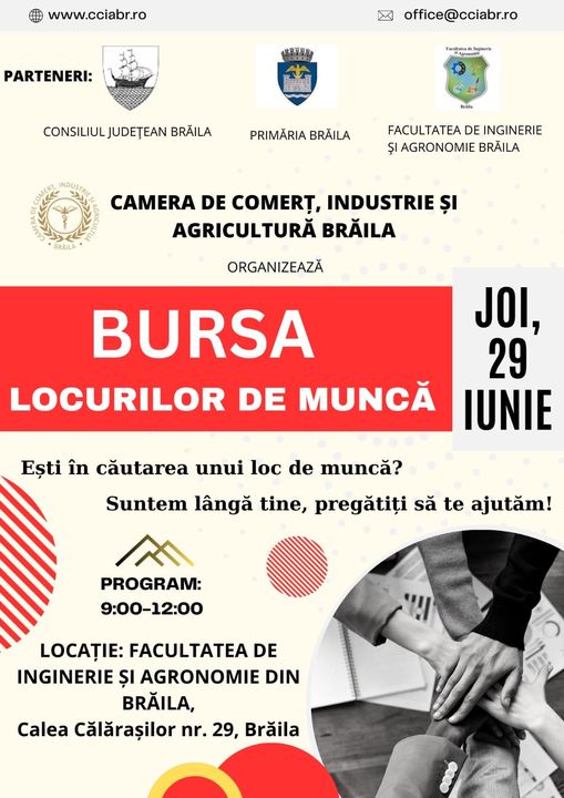 Camera de Comerț, Industrie și Agricultură Brăila, în parteneriat cu Consiliul Jedețean Brăila, Primăria Municipiului Brăila și Facultatea de Inginerie și Agronomie Brăila, organizează joi, 29 iunie 2023, “Bursa locurilor de muncă”.
