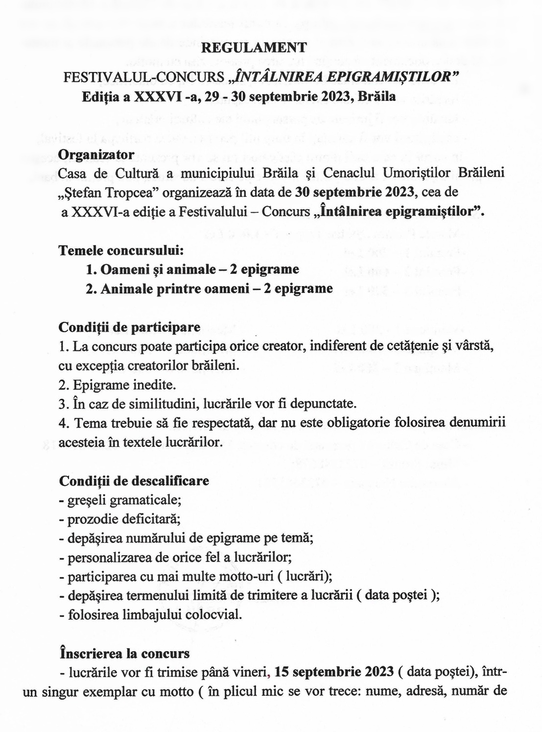 Casa de Cultură a Municipiului Brăila, în colaborare cu Cenaclul Umoriștilor Brăileni (C.U.B.) “Ștefan Tropcea”, organizează cea de a XXXVI-a ediție a Festivalului Concurs “Întâlnirea Epigramiștilor”.