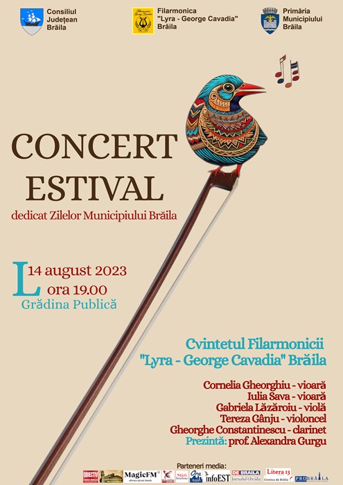 Luni, 14 august 2023, ora 19:00, foișorul din Grădina Publică din Municipiul Brăila va fremăta în acordurile îndrăgitului cvintet al Filarmonicii “Lyra-George Cavadia”, pe ritmurile excentrice ale unor compozitori precum Jose White Lafitte, Gerardo Matos Rodriguez, Joaquin Malats, Jacob Gade, Carlos Gardel, Astor Piazzolla, etc.