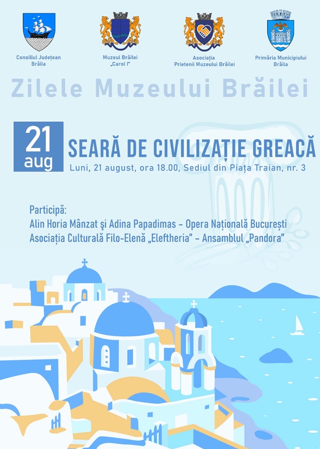 Seară de civilizație greacă – ora 18.00, la sediul Muzeului Brăilei “Carol I” (Piața Traian, nr. 3), sala “Regele Ferdinand și Regina Maria”