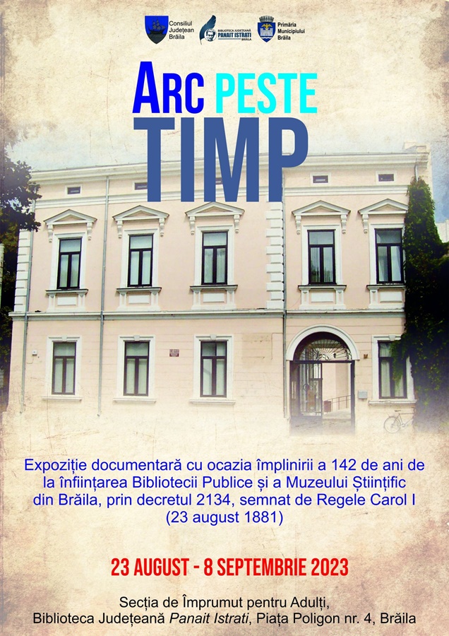Expoziția “Arc peste timp” reunește volumele aniversare: 125, 130, 135 și 140 de ani de bibliotecă publică la Brăila, ex-libris-uri, medalii și documente publicate sub egida Editurii Proilavia care funcționează în cadrul Bibliotecii Județene. Expoziția este realizată de bibliotecar Silvia Iacob și poate fi vizionată în perioada 23 august – 8 septembrie 2023.