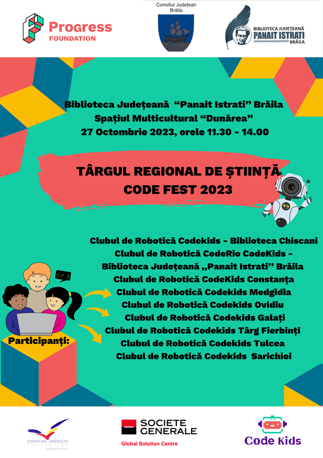 Copiii pasionați de știință și tehnologie din patru județe își dau întâlnire, vineri, 27 octombrie, între orele 11:30 – 14:00, la Biblioteca Județeană “Panait Istrati”, la cea de-a II-a ediție a Târgului Regional de Știință “CODE Kids FEST” Brăila 2023.