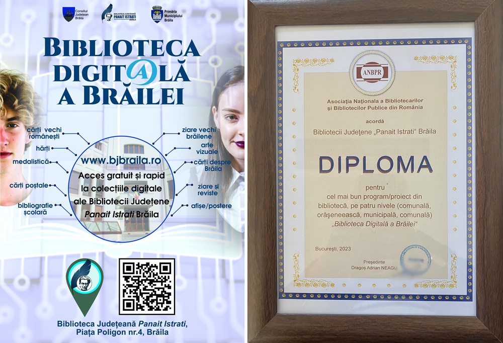 Biblioteca Digitală a Brăilei, cel mai “tânăr” proiect al Bibliotecii Județene “Panait Istrati”, a primit diploma pentru cel mai bun program de bibliotecă din partea Asociației Naționale a Bibliotecarilor și Bibliotecilor Publice din România (ANBPR), în cadrul Conferinței naționale de la București “Biblioteci pentru comunități incluzive”.