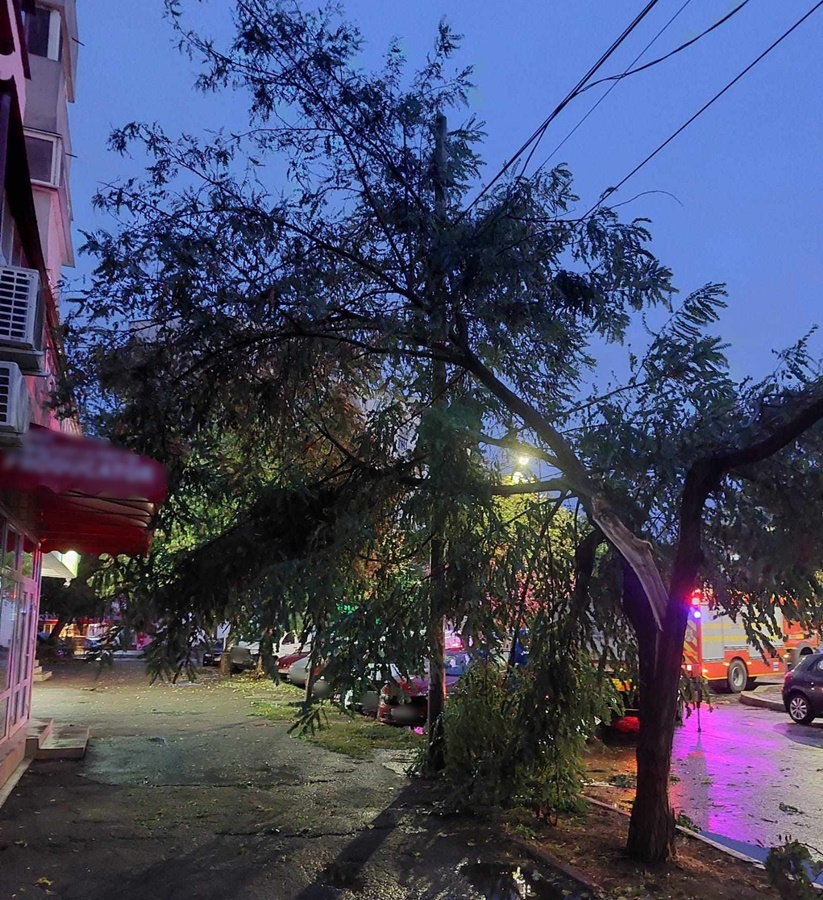 Pe Aleea Mugurilor, copacul a căzut pe o țeavă de alimentare cu gaze naturale, fiind solicitată intervenția echipajului distribuitorului de gaze pentru remedierea defecțiunii.