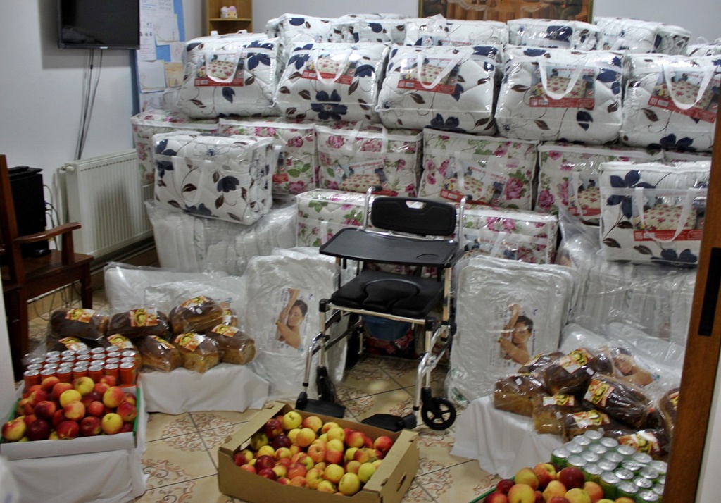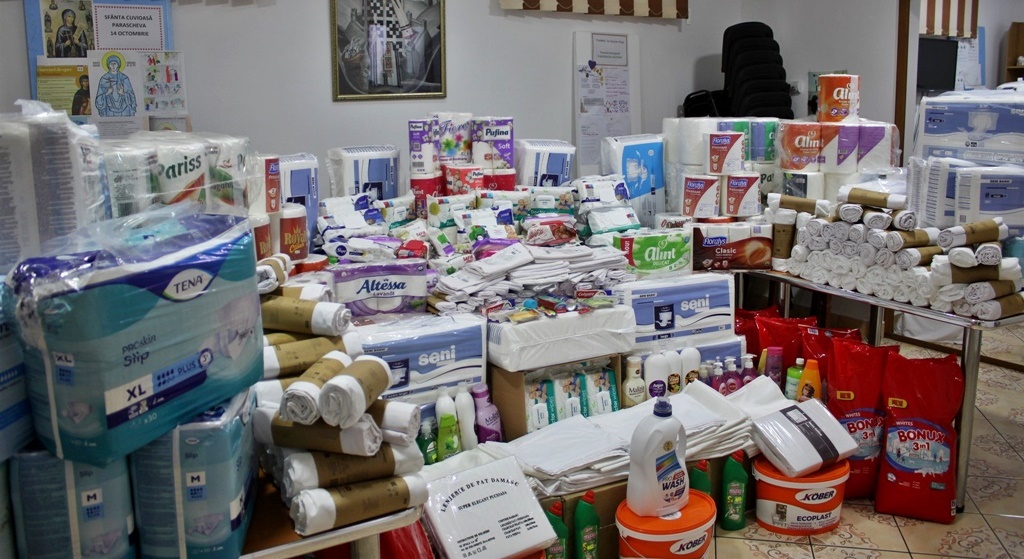 “Preoţii slujitori de la Parohia «Sfinţii Arhangheli Mihail şi Gavriil» din Brăila, însoțiți de câțiva consilieri parohiali şi elevi voluntari, au oferit lenjerii şi huse pentru paturi, pilote, feţe de pernă, scutece pentru adulţi, produse igenico-sanitare, scaun cu rotile pentru persoanele cu handicap locomotor şi alte produse, precum şi alimente neperisabile pentru 50 de persoane asistate în acest Centru social.