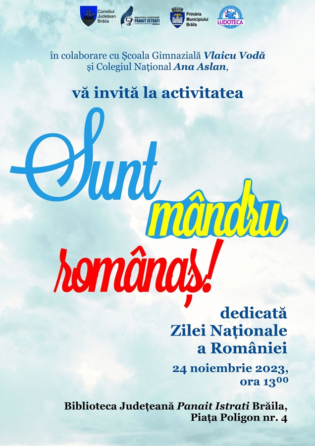 Așadar, vineri, 24 noiembrie 2023, de la ora 13:00, brăilenii sunt așteptați la un spectacol literar-artistic “Sunt mândru românaș!”, coordonat de doamnele profesor Mariana Mangiurea, Nicoleta Holban, Mihaela Bucățică și Mariana Băcanu.