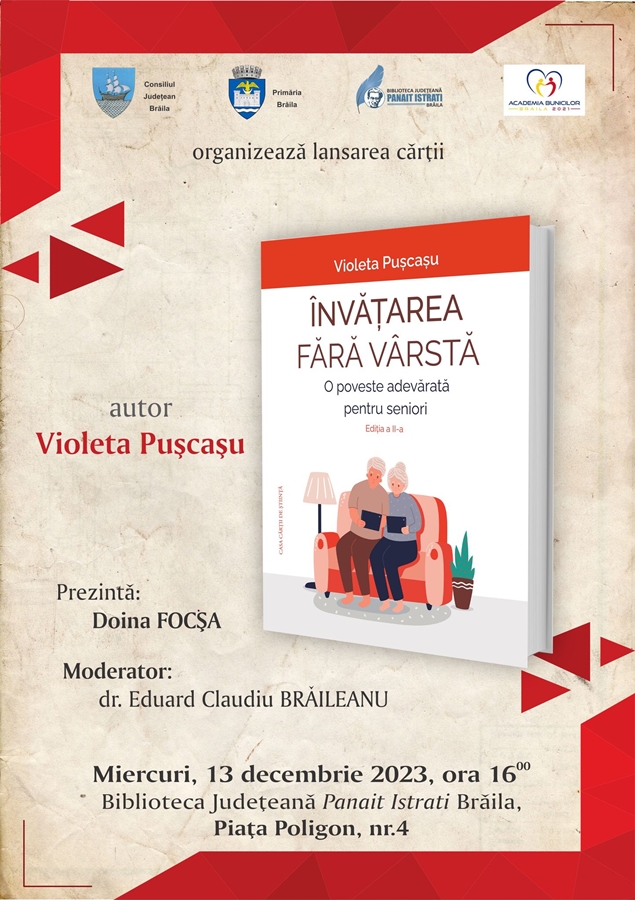 Miercuri, 13 decembrie 2023, începând cu ora 16.00, la Biblioteca Județeană “Panait Istrati” Brăila va avea loc lansarea volumului “Învățarea fără vârstă. O poveste adevărată pentru seniori”, ediția a II-a, scris de Violeta Pușcașu.