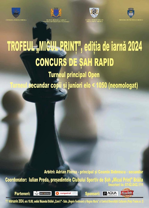 Clubul Sportiv Micul Prinț din Brăila invită sportivii șahiști să participe la “Trofeul Micul Prinț”, ediția de iarnă 2024, un concurs de șah rapid ce va avea loc în data de 11 februarie 2024, la Muzeul Brăilei “Carol I”, Sala Regele Ferdinand și Regina Maria și Centrul Diversității Culturale (Piața Traian nr. 3).