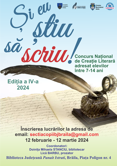 Biblioteca Județeană “Panait Istrati” Brăila organizează Concursul Naţional de Creaţie Literară “Şi eu ştiu să scriu!”, ediţia a IV-a, cu scopul de a descoperi și promova copiii talentați cu aptitudini în domeniul literaturii (poezie şi proză scurtă).