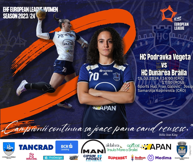 Drumul european continuă pentru echipa de handbal fanion a județului Brăila. Jucătoarele dispută în deplasare meciul cu Podravka Vegeta (Croația), contând pentru sferturile de finală a EHF European League.