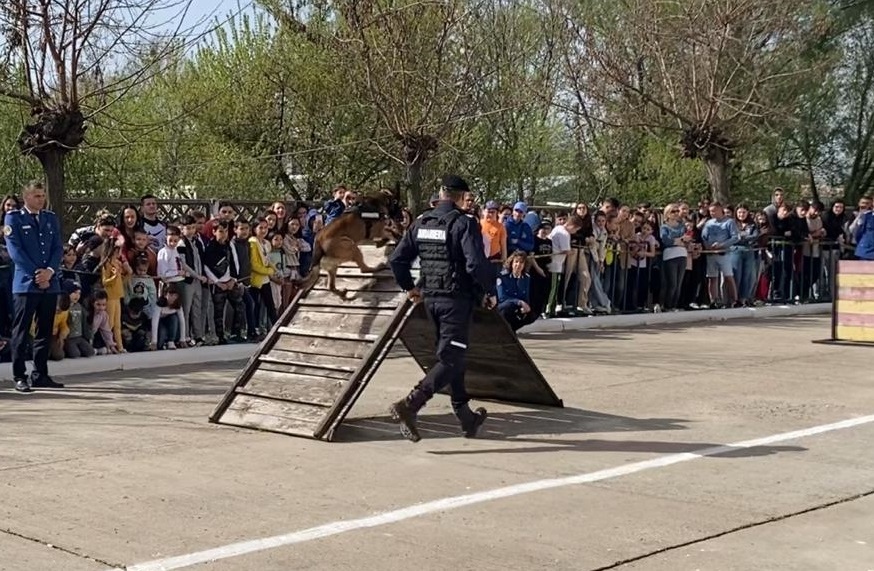 Cel de-al doilea moment, de altfel unul dintre cele mai așteptate de către copiii prezenți, a fost prezentarea câinilor de serviciu specializați în misiuni de patrulare – intervenție. Cei patru conductori, împreună cu colegii patrupezi, au “defilat” în fața mulțimii, “Fedor”, “Jack”, “Lord” și “Tuda” încântândui mai ales pe copii. Exercițiile de disciplină au cuprins și parcurgerea unui traseu cu obstacole, spre deliciul celor mici. Momentul a continuat cu simularea prinderii unui individ recalcitrant care intenționa să îl atace pe jandarm, precum și cu prinderea altui individ care sustrăgea bunuri dintr-un auto. Pe parcursul desfășurării exercițiilor, s-au evidențiat camaraderia câinilor, disciplina și dragostea față de conductori.