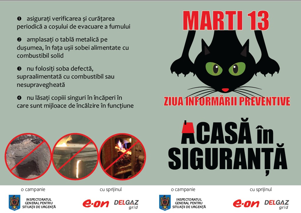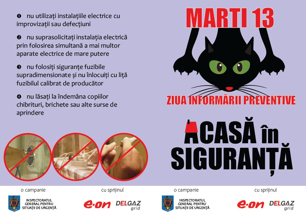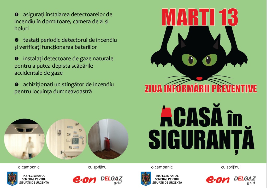 Derulate în colaborare cu E-On România, sub sloganul “Preveniţi ghinionul”, activităţile informativ-educative ce vor avea loc urmăresc conştientizarea populației asupra pericolelor la care se poate expune în cazul nerespectării măsurilor şi regulilor de comportare specifice tipurilor de situaţii de urgenţă.