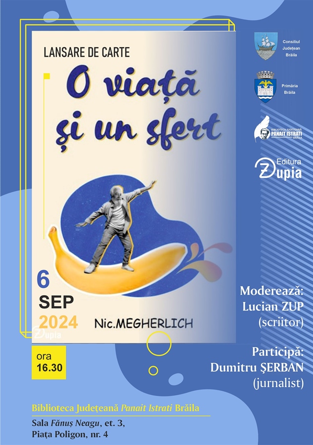 Vineri, 6 septembrie 2024, începând cu ora 16:30, la Biblioteca Județeană “Panait Istrati” Brăila va avea loc lansarea volumului de schițe “O viață și un sfert” de Neculai Megherlich.