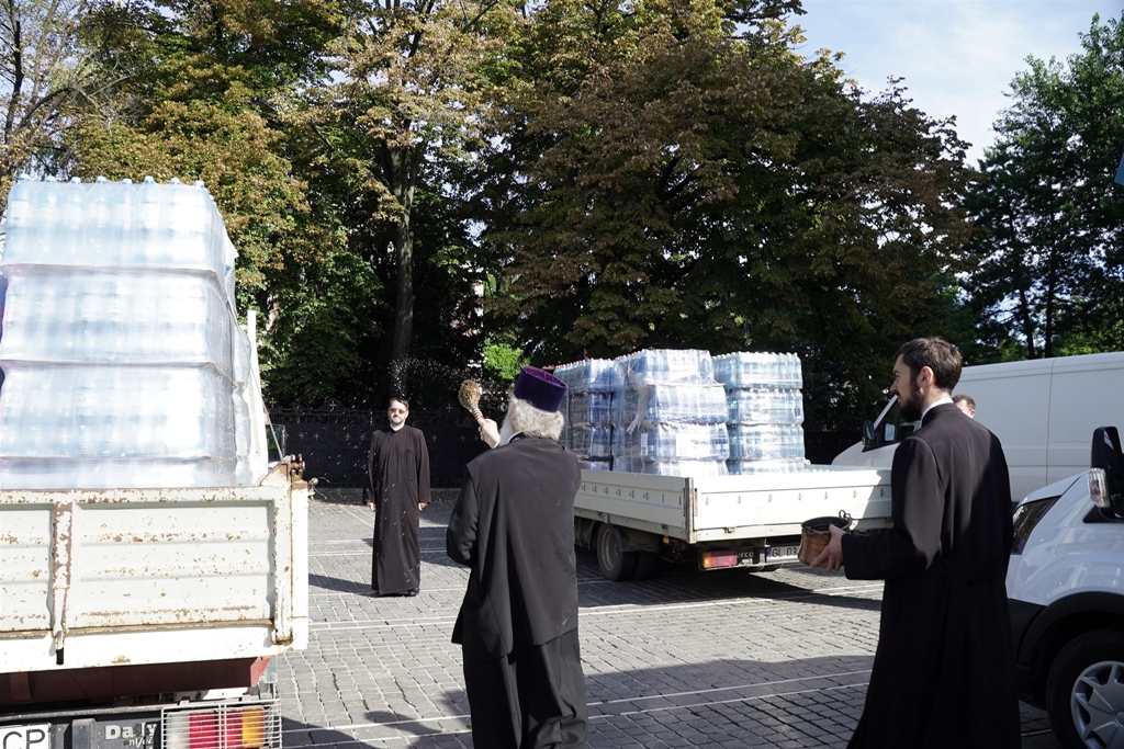 Transportul special cu ajutoare umanitare a plecat din faţa Catedralei arhiepiscopale, nu înainte de a fi binecuvântate şi stropite cu aghiasmă de către ierarhul Dunării de Jos.