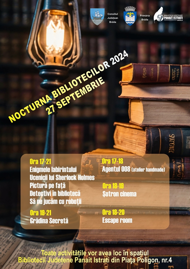 Vineri, 27 septembrie, începând cu ora 17:00, brăilenii de toate vârstele sunt invitați să participe la cea de-a XV-a ediție a “Nocturnei Bibliotecilor”, sub tema “Noaptea Detectivilor de Carte”.
