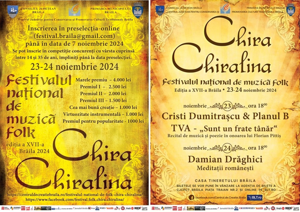 Consiliul Județean Brăila, prin Centrul Județean pentru Conservarea și Promovarea Culturii Tradiționale Brăila, și Primăria Municipiului Brăila organizează în intervalul 23-24 noiembrie 2024, cea de-a XVII-a ediţie a Festivalului naţional de folk “Chira Chiralina”.