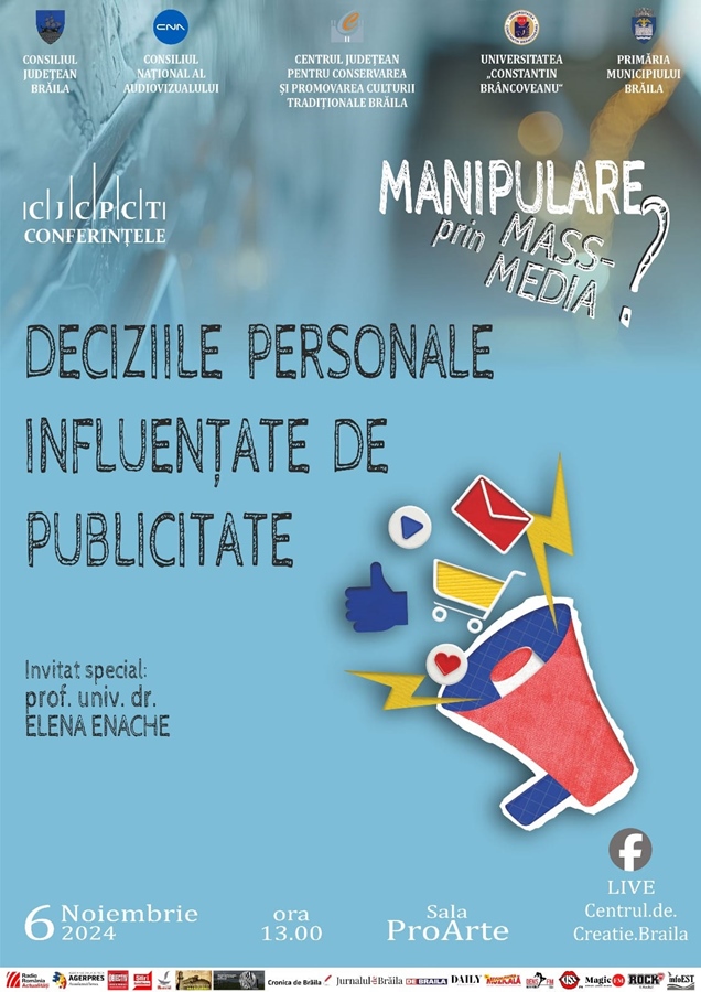 Consiliul Județean Brăila, prin Centrul Județean pentru Conservarea și Promovarea Culturii Tradiționale Brăila, Primăria Municipiului Brăila, în parteneriat cu Consiliul Național al Audiovizualului și Universitatea “Constantin Brâncoveanu” organizează în data de 6 noiembrie 2024, începând cu ora 13:00, Conferința “Manipulare prin mass media – Deciziile personale influențate de publicitate”.