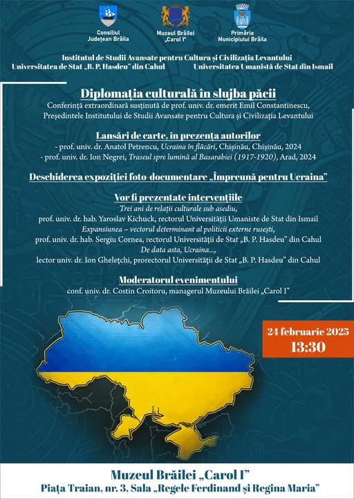 Luni, 24 februarie, începând cu ora 13:30, va avea loc un eveniment cultural sub titlul “Diplomația culturală în slujba păcii”, la Muzeul Brăilei “Carol I”, sala “Regele Ferdinand și Regina Maria” (Piața Traian nr. 3).