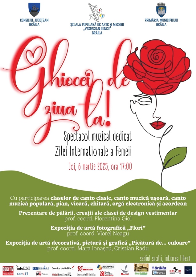 Joi, 6 martie 2025, începând cu ora 17:00, în cadrul Școlii Populare de Arte “Vespasian Lungu” din Municipiul Brăila, va avea loc spectacolul muzical “Ghiocei de ziua ta!”.