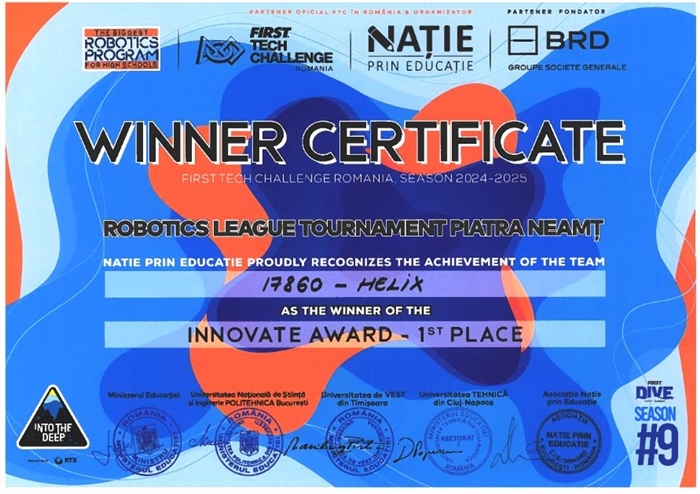 Duminica trecută, echipa de robotică “Helix“ a Bibliotecii Județene “Panait Istrati Brăila” a reușit să mențină performanța la un nivel superior, obținând la Pitești Arena premiul “2 INNOVATE” în cadrul competiției “First Tech Challenge România 2024 – 2025”, desfășurată în perioada 14 – 16 martie 2025.