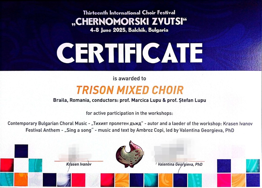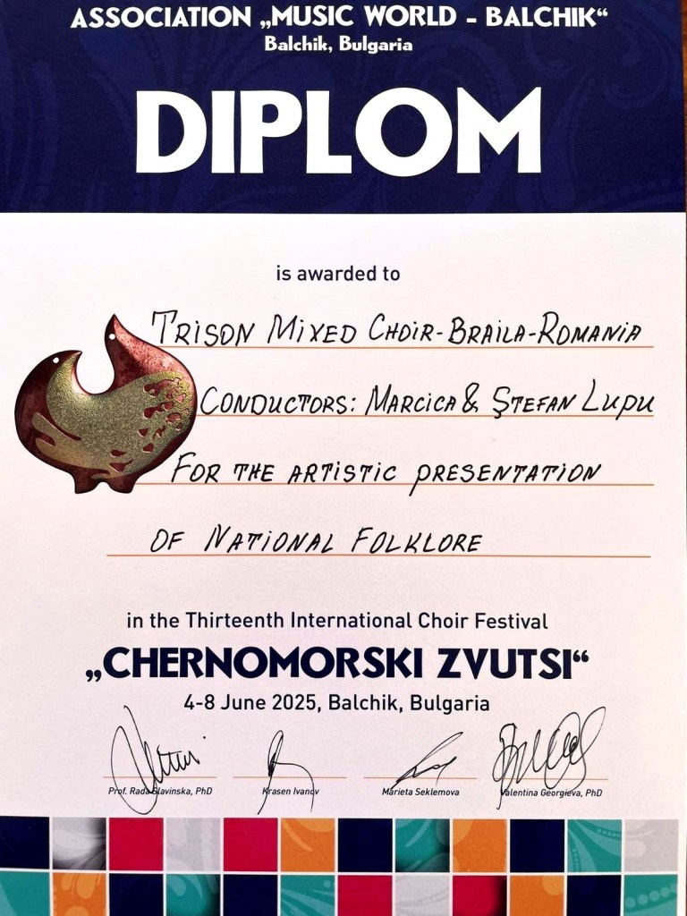 În perioada 4–8 iunie 2025, Corul Mixt “Trison”, format din cursanți ai Școlii Populare de Arte “Vespasian Lungu” din Brăila, a reprezentat cu mândrie România la prestigiosul Festival Internațional de Muzică Corală “Chernomorski zvutsi”, desfășurat în Balchik, Bulgaria.